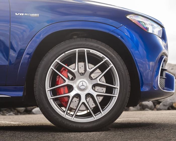 Supersized AMG wheels fill the flared wheel arches and frame the substantial brake hardware. GLE 53 wheels are available in seven designs from 20 to 22 inches.