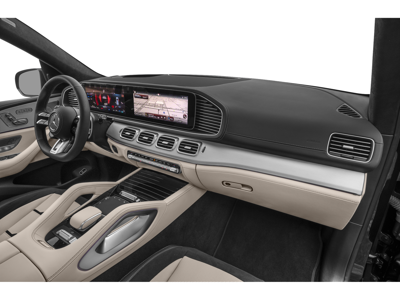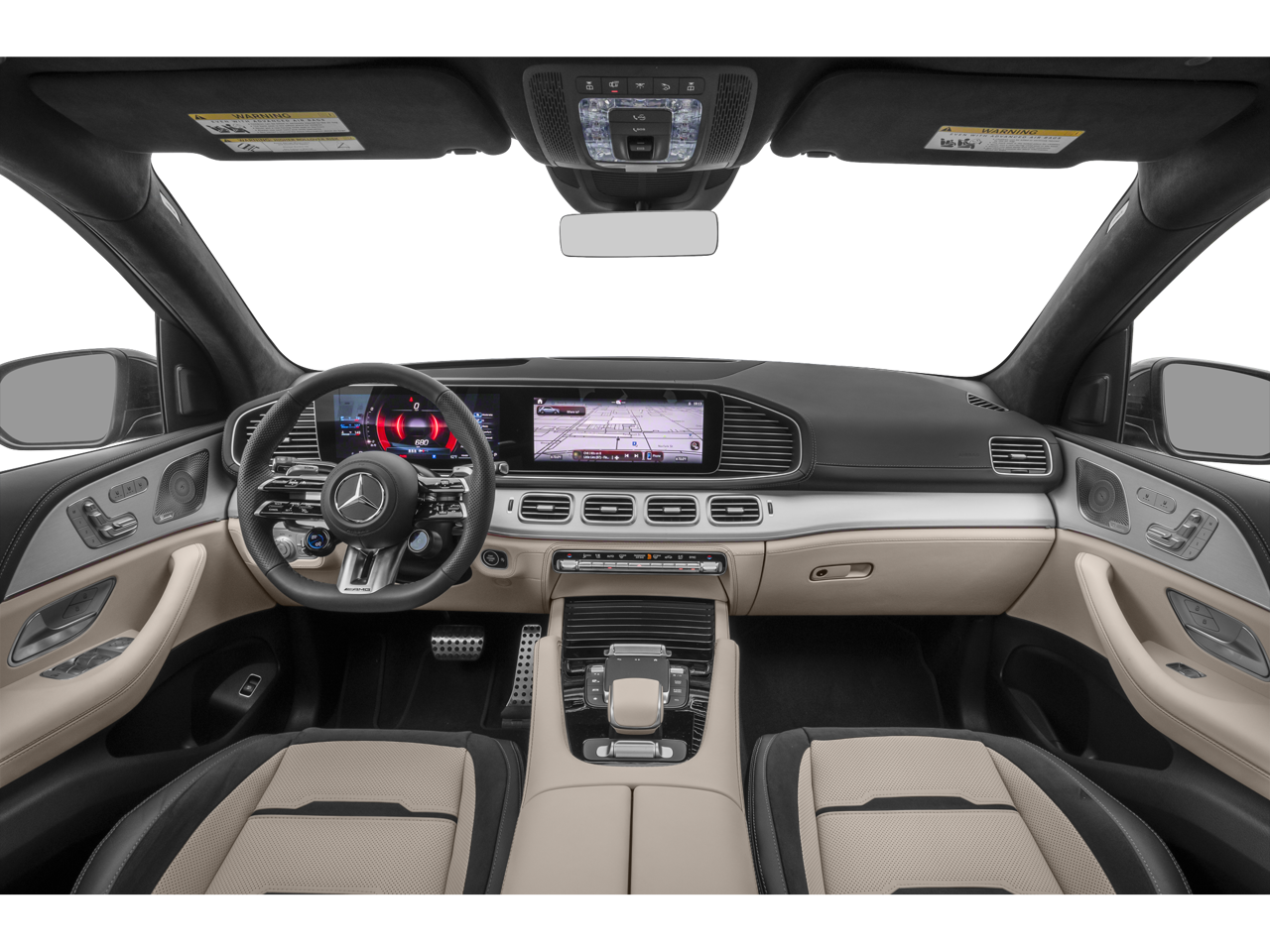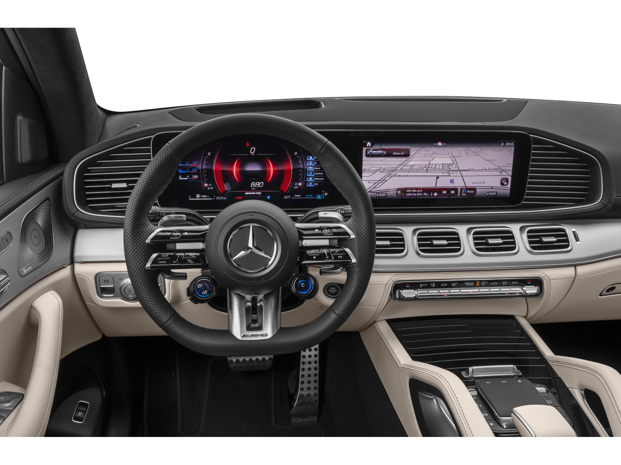 Heated Leather Seats, Navigation, Moonroof, Panoramic Roof, Full-Time 4MATIC® All-Wheel, WHEELS: 22 AMG® CROSS-SPOKE FORGED, BRUSHED ALUMINUM ILLUMINATED RUNNING. 4-ZONE CLIMATE CONTROL, REAR SIDE AIRBAGS, Turbo Charged. Polar White exterior and Macchiato Beige interior.